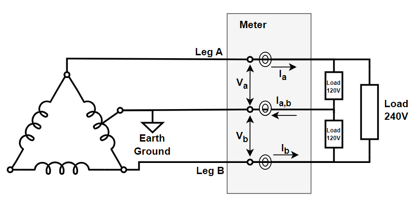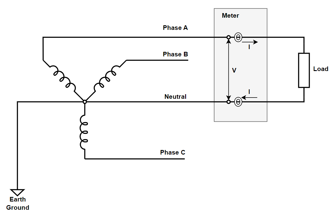 Measures one phase and neutral pair; both voltage and current are sensed from the same line.
