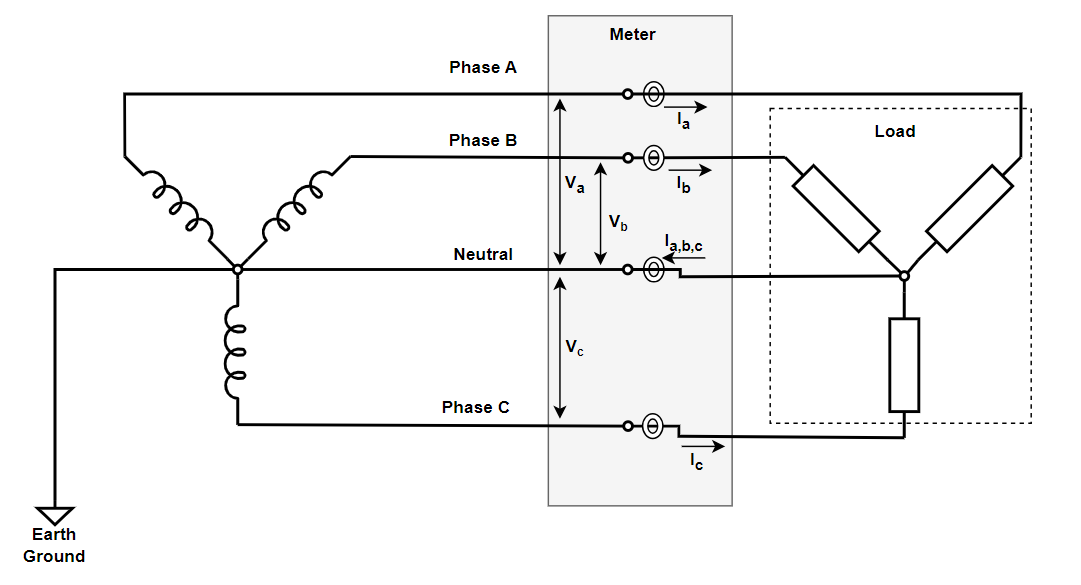 Involves measurement of three phase voltages and currents (generally with a neutral reference).